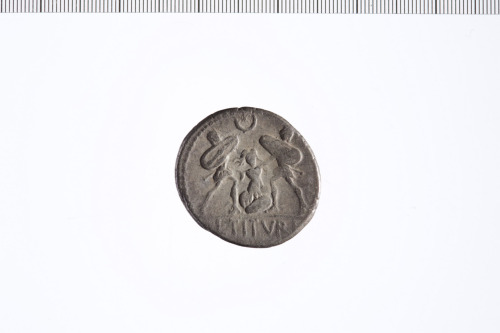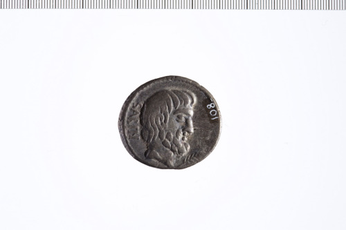 Testa barbara di re Tatius a d., prima ramo di palma. Contorno perlinato.
