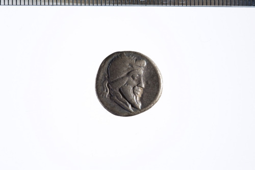 Testa barbata e con diadema alato a d.; c.l.