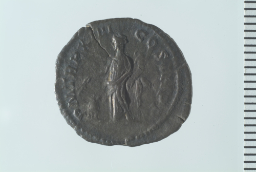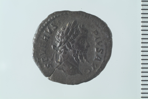 Testa laureata di Settimio Severo a d.; contorno perlinato.