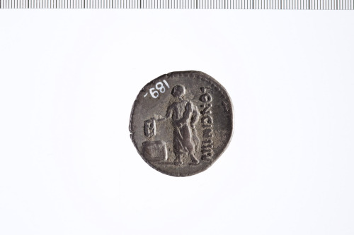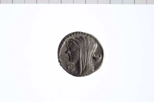 Testa di Vesta velata e diademata a s.; a d. un piatto. Cerchio perlinato.