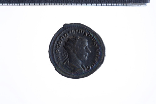 Busto radiato di Gordiano III a d. con corazza e paludamentum, di tre quarti di spalle; contorno perlinato.