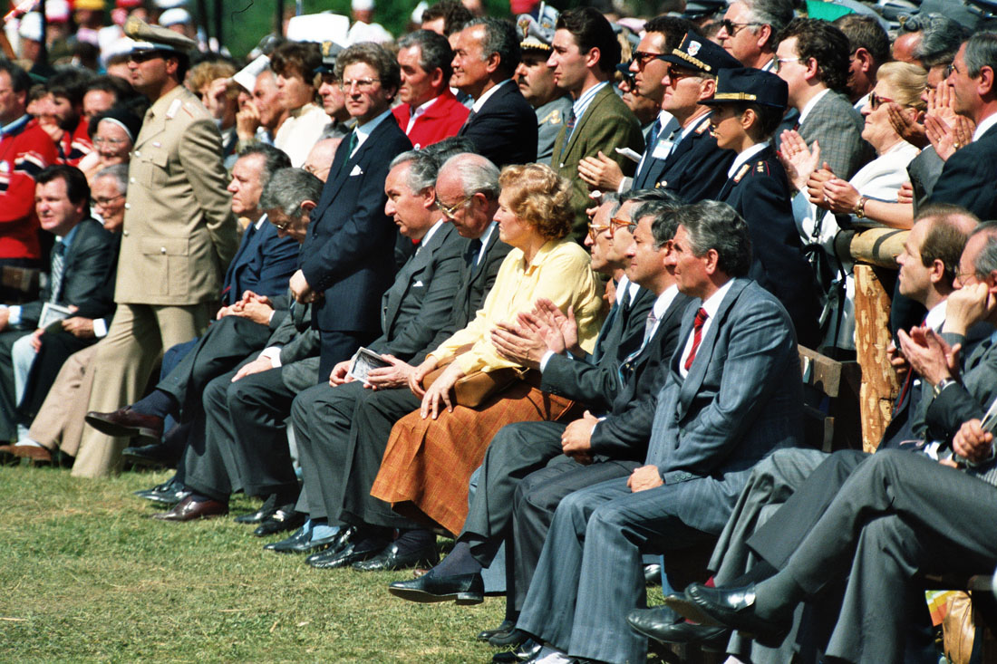 Prima fila del pubblico, tra cui Bernini Carlo, allora Prtesidente della Regione Veneto, durante la Santa Messa celebrata da Papa Giovanni Paolo II in occasione della festa votiva di San Giovanni Gualberto, patrono degli operatori forestali a Pramarino in Val Visdende