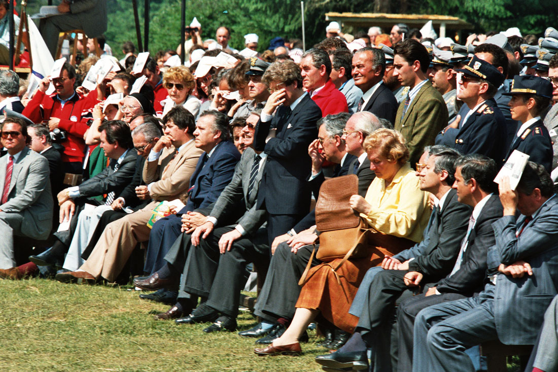 Pubblico della prima fila durante la celebrazione dell'Eucarestia in occasione della festa votiva di San Giovanni Gualberto, patrono degli operatori forestali a Pramarino in Val Visdende