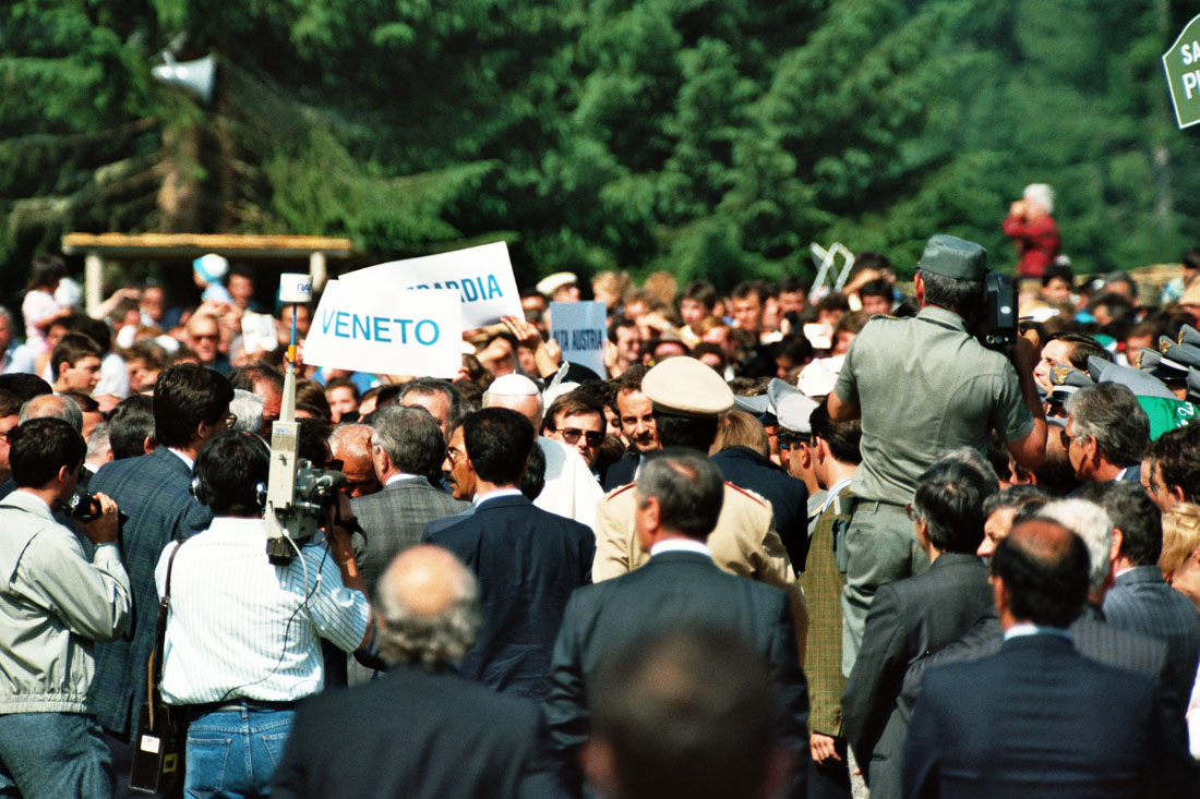 Papa Giovanni Paolo II tra la folla a seguito della celebrazione dell'Eucarestia in occasione della festa votiva di San Giovanni Gualberto, patrono degli operatori forestali a Pramarino in Val Visdende