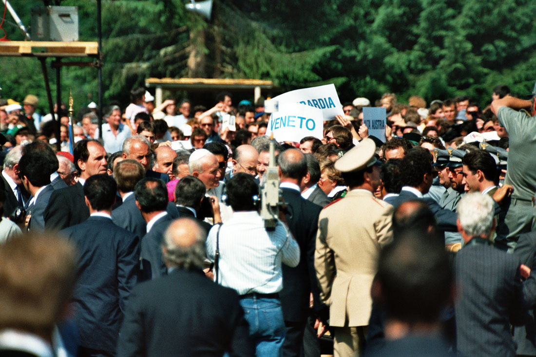 Papa Giovanni Paolo II tra la folla a seguito della celebrazione dell'Eucarestia in occasione della festa votiva di San Giovanni Gualberto, patrono degli operatori forestali a Pramarino in Val Visdende