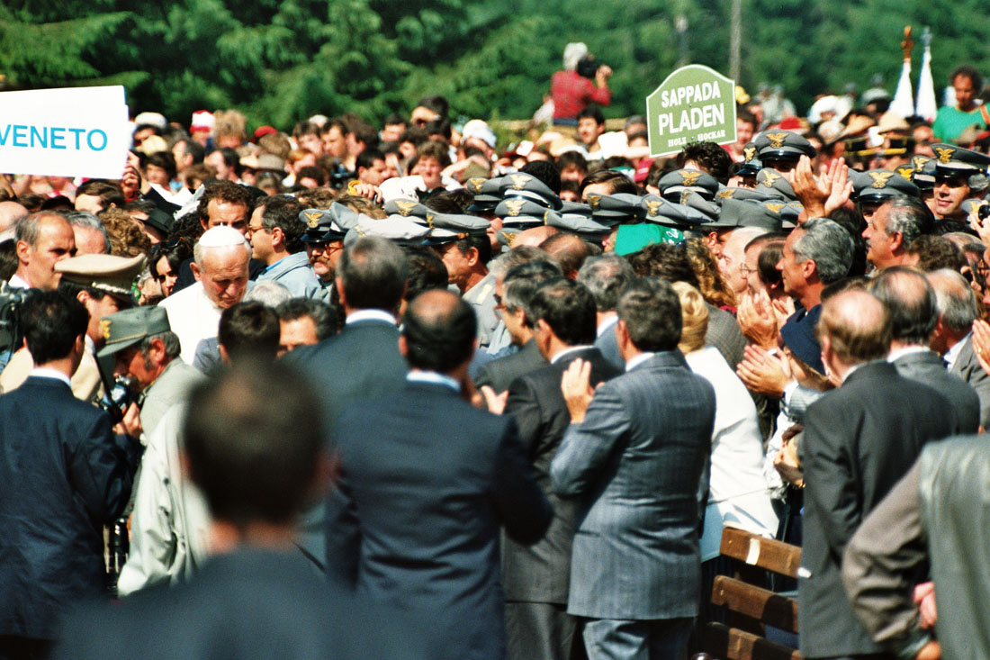 Papa Giovanni Paolo II tra la folla a seguito della celebrazione dell'Eucarestia in occasione della festa votiva di San Giovanni Gualberto, patrono degli operatori forestali a Pramarino in Val Visdende