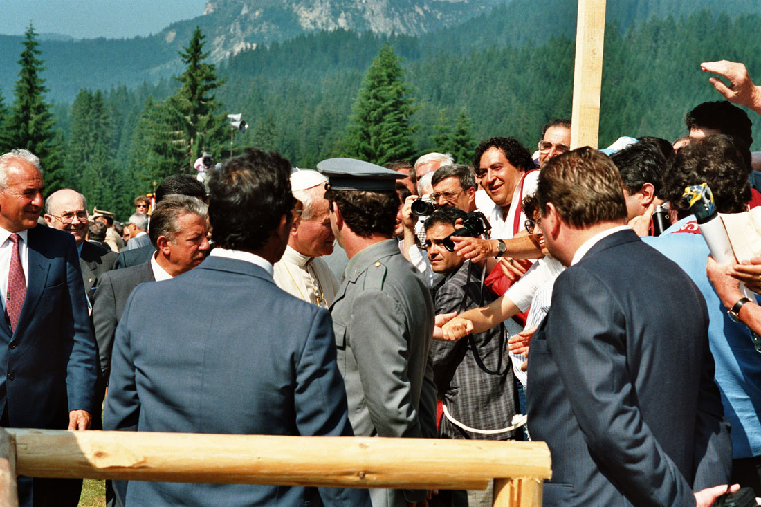 Papa Giovanni Paolo II tra la folla a seguito della celebrazione dell'Eucarestia in occasione della festa votiva di San Giovanni Gualberto, patrono degli operatori forestali a Pramarino in Val Visdende