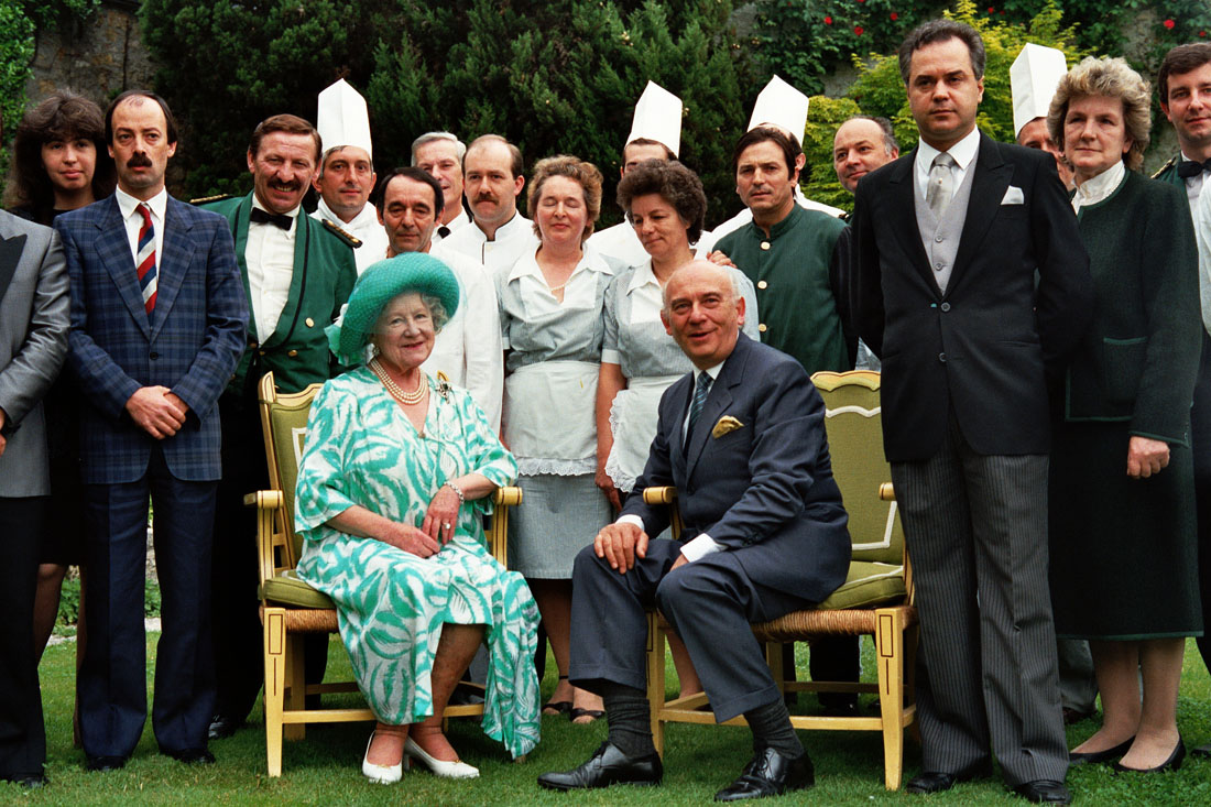 La Regina Madre in posa per le foto di rito con il personale di servizio all'Hotel Villa Cipriani di Asolo