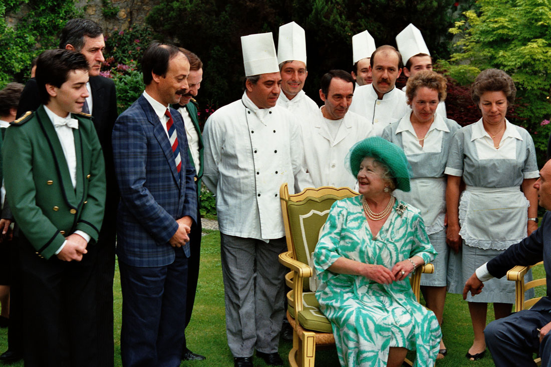 La Regina Madre in posa per le foto di rito con il personale di servizio all'Hotel Villa Cipriani di Asolo