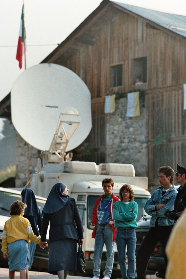 In primo piano dei giovani del posto e due suore di spalle. Sullo sfondo casa e una grande antenna parabolica. Durante la visita del Papa Giovanni Paolo II in occasione della festa votiva di San Giovanni Gualberto, patrono degli operatori forestali a Pramarino in Val Visdende