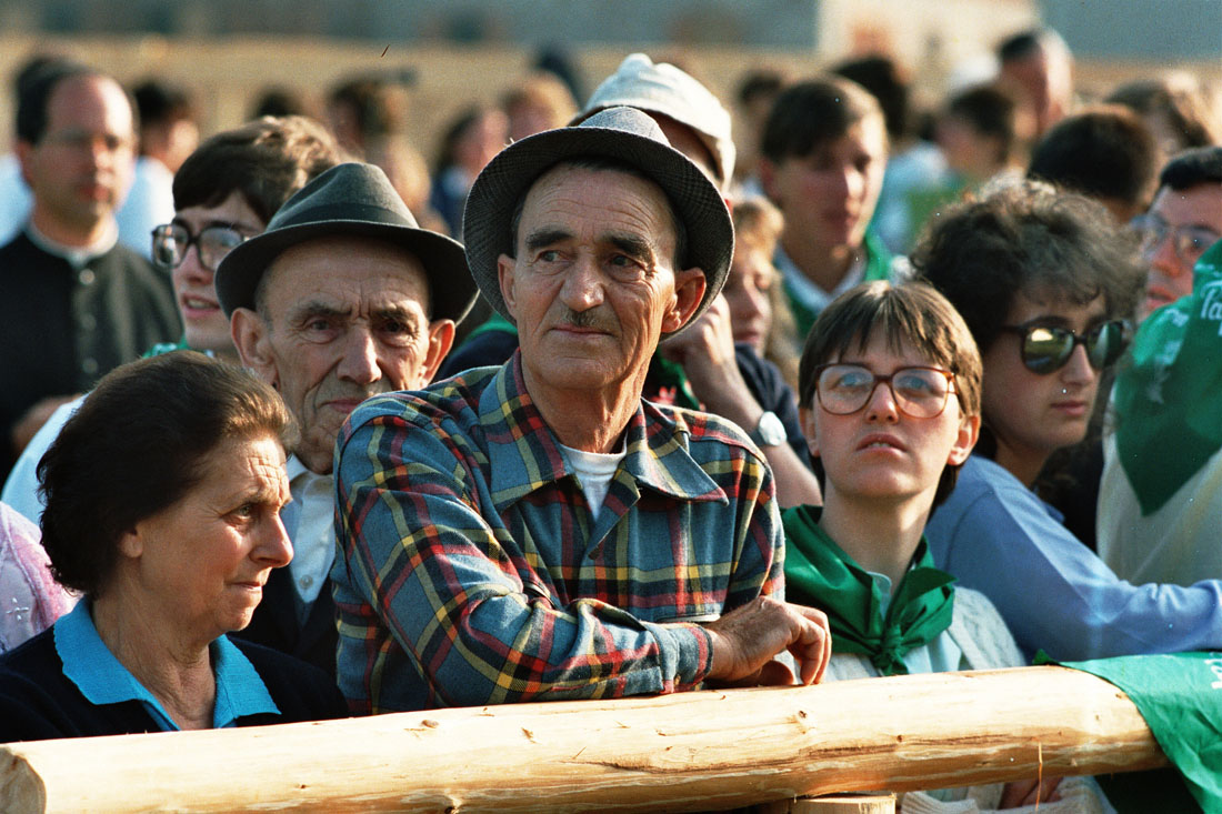 Fedeli a Pramarino in Val Visdende durante la visita del Papa Giovanni Paolo II in occasione della festa votiva di San Giovanni Gualberto, patrono degli operatori forestali a Pramarino in Val Visdende