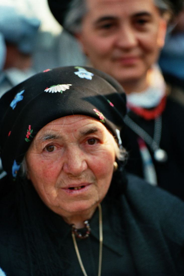 Fedeli a Pramarino in Val Visdende durante la visita del Papa Giovanni Paolo II in occasione della festa votiva di San Giovanni Gualberto, patrono degli operatori forestali a Pramarino in Val Visdende