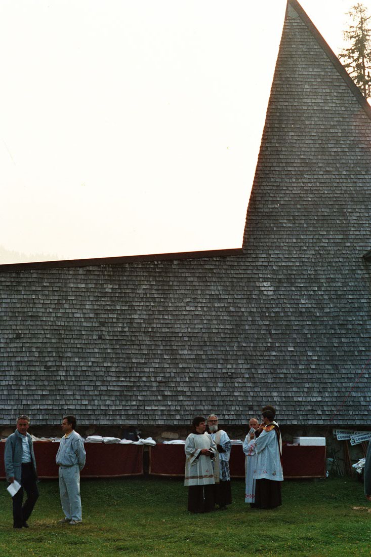 Preti durante la preparazione della messa che celebrò Papa Giovanni Paolo II in occasione della festa votiva di San Giovanni Gualberto. Sullo sfondo parete geometrica della Chiesa della Madonna delle Nevi