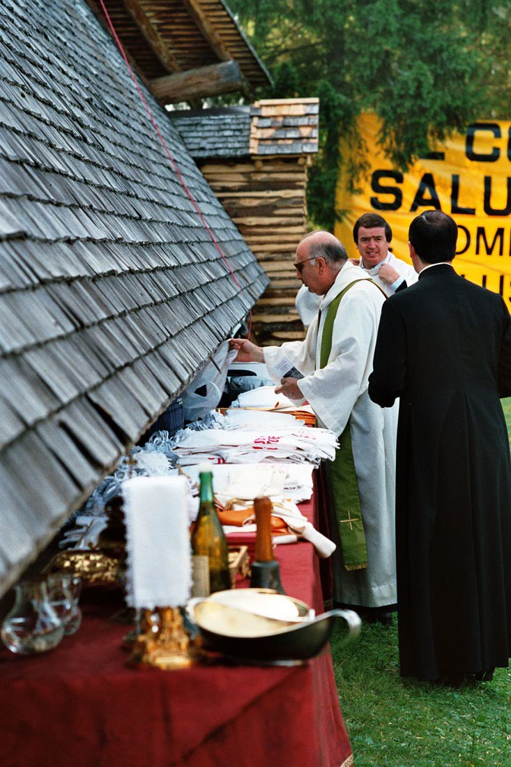 Preti ripresi durante la preparazione della della messa celebrata da Papa Giovanni Paolo II. Tavola con oggetti liturgici vicino alla chiesa della Madonna delle nevi di Pramarino in Val Visdende