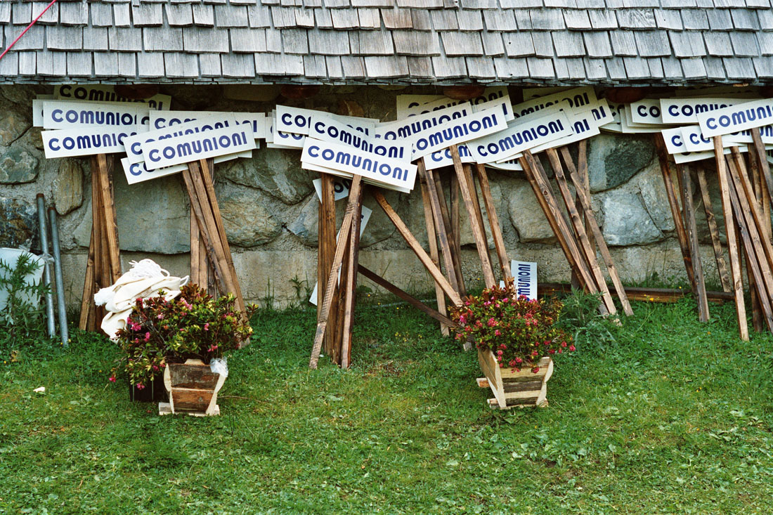 Gruppo si cartelli con scritto "comunioni" appoggiati sulla parete della chiesa della Madonna delle nevi di Pramarino in Val Visdende.