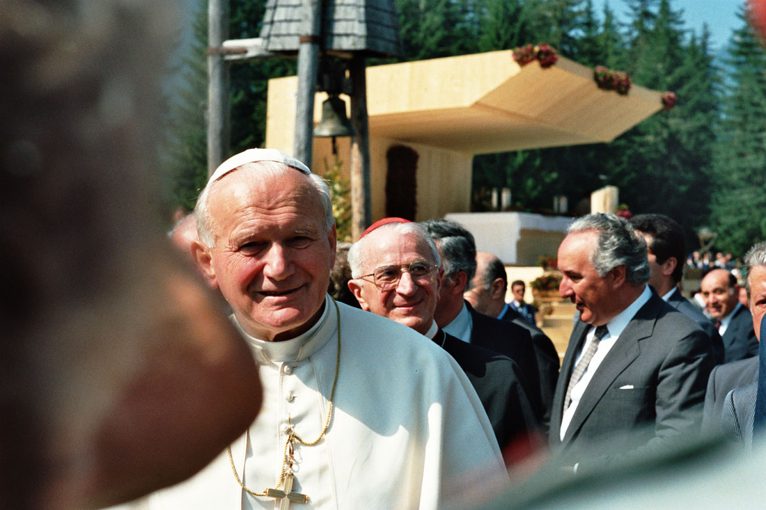 Papa Giovanni Paolo II con alle sue spalle a sinistra Il Presidente della Regione Veneto Bernini Carlo e Il Cardinale Cè Marco, dopo la celebrazione dell'Eucarestia in occasione della festa votiva di San Giovanni Gualberto, patrono degli operatori forestali a Pramarino in Val Visdende