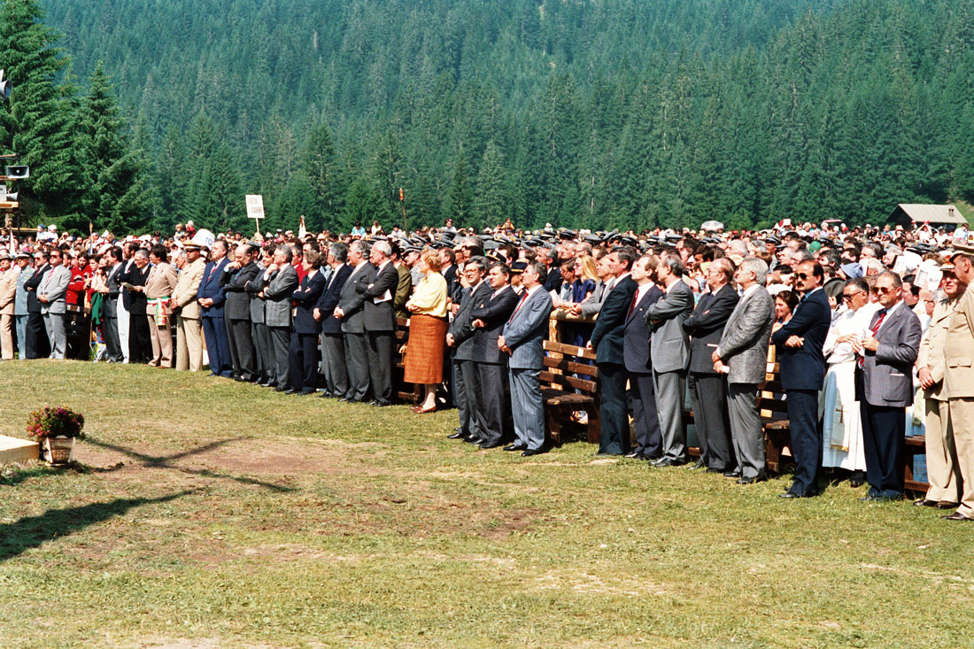 Inizio della messa. Pubblico in piedi prima dell'inizio della messa del Papa Giovanni Paolo II a Pramarino in Val Visdende