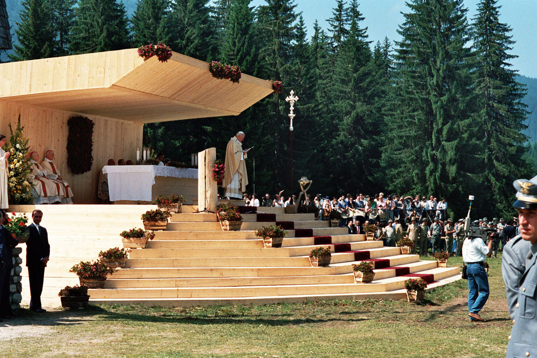Inizio della messa. Il Papa Giovanni Paolo II saluta il pubblico dal palco a Pramarino in Val Visdende