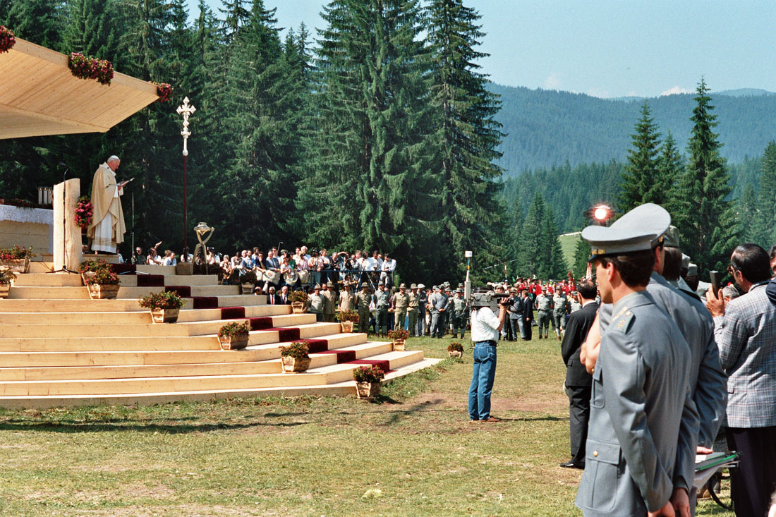 Inizio della messa. Il Papa Giovanni Paolo II saluta il pubblico dal palco a Pramarino in Val Visdende