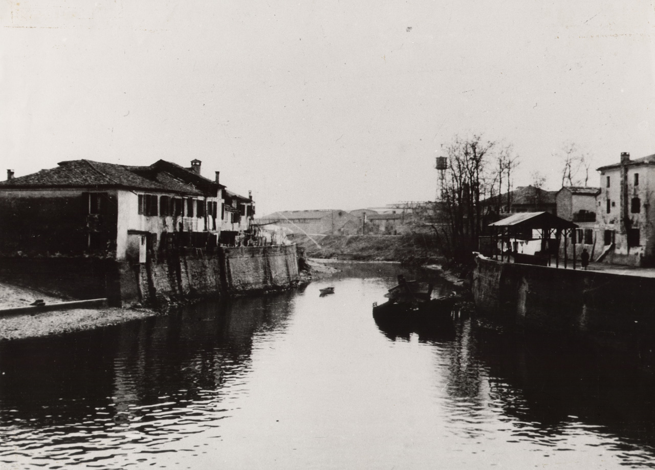 Battaglia Terme: veduta del canale di Sotto come si presentava nel 1945 circa. Si osservano a sinistra le abitazioni di Via Ortazzo, sulla destra Via del Porto, dove avevano sede la pescheria e il mercato ortofrutticolo, e al centro parte degli edifici delle Officine Elettromeccaniche di Battaglia, poi Magrini Galileo a partire dal 1973.
