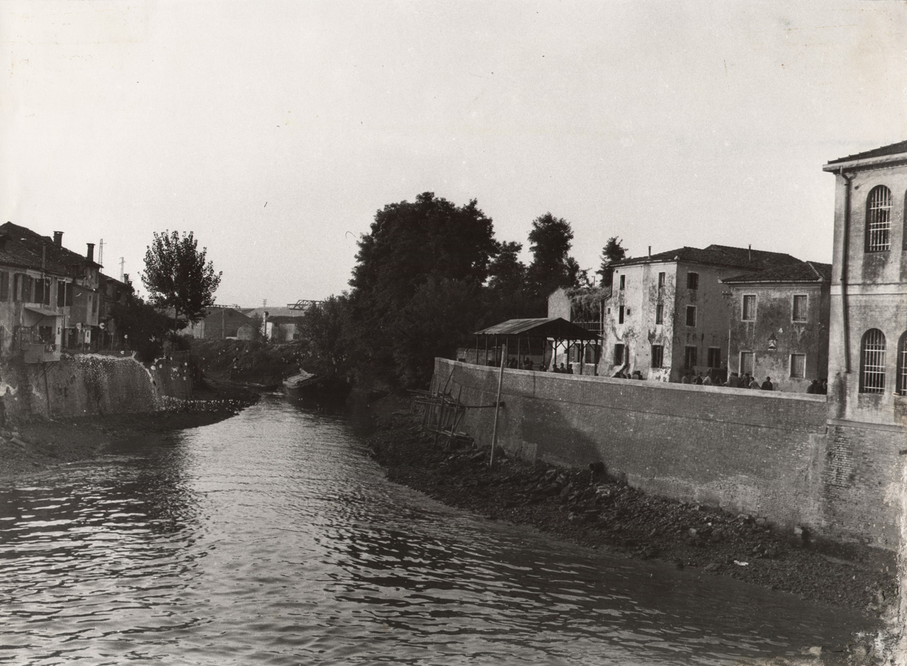 Battaglia Terme: veduta del canale di Sotto così come si presentava nel 1945 circa. Si osservano: a sinistra le abitazioni di Via Ortazzo; sulla destra Via del Porto, dove avevano sede la pescheria e il mercato ortofrutticolo, e al centro parte degli edifici delle Officine Elettromeccaniche di Battaglia, poi Magrini Galileo a partire dal 1973.