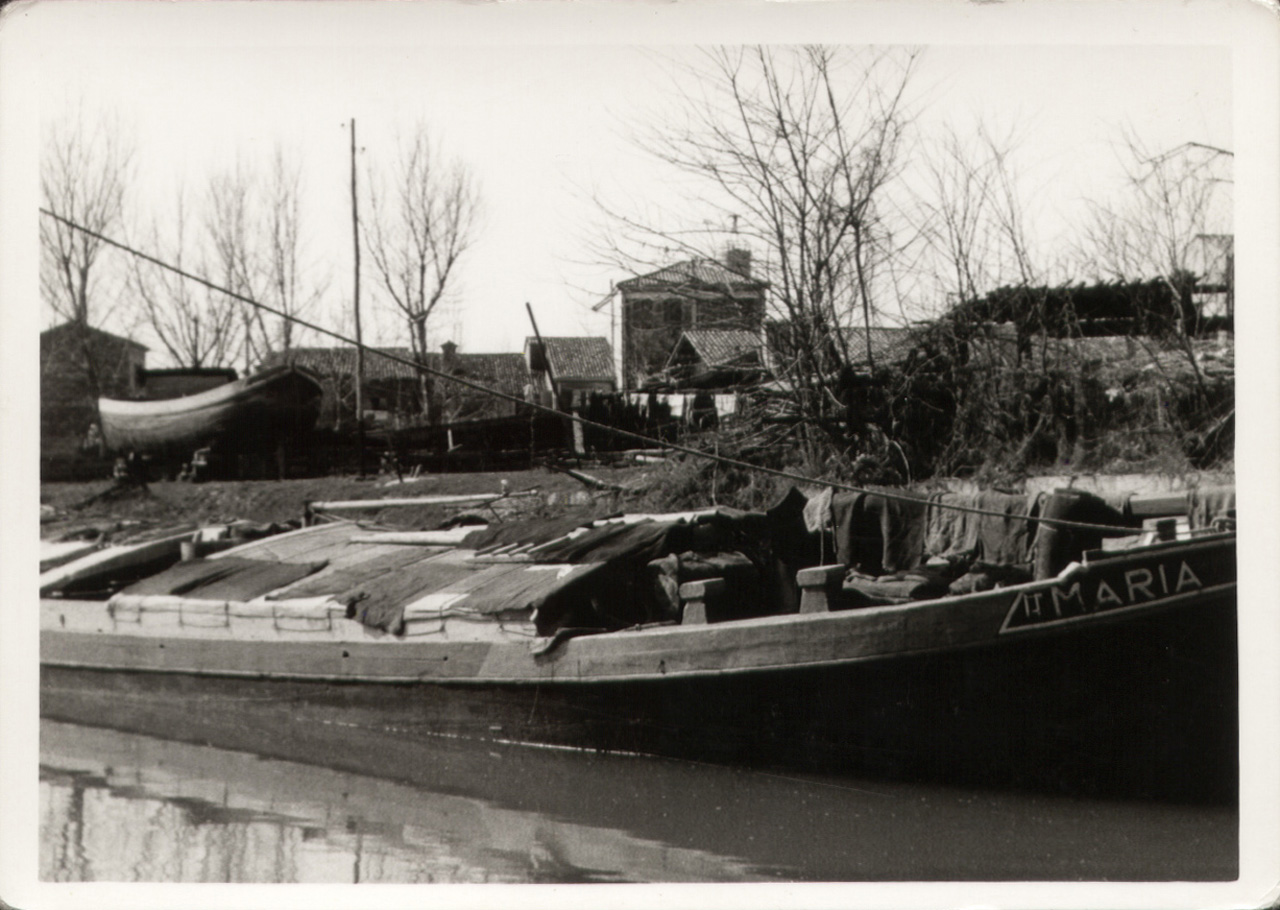 Battaglia Terme: si osserva il cantiere (squero) dei F.lli Cobelli di Pescantina come si presentava negli anni Cinquanta del 1900, quando era situato in prossimità dell'incrocio tra il canale di Sotto e il canale Rialto; in primo piano un'imbarcazione (il burcio Maria II) ormeggiata davanti al cantiere.