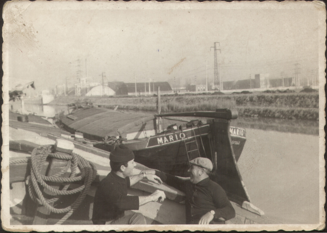 Ca' Tiepolo: foto ricordo degli anni Cinquanta del 1900 dei barcari Mario Rottanova, a sinistra, e Antonio Cavallaro a bordo di un'imbarcazione (il burcio Sergio di proprietà di Cavallaro); in secondo piano, invece, il burcio Mario di proprietà di Rottanova.