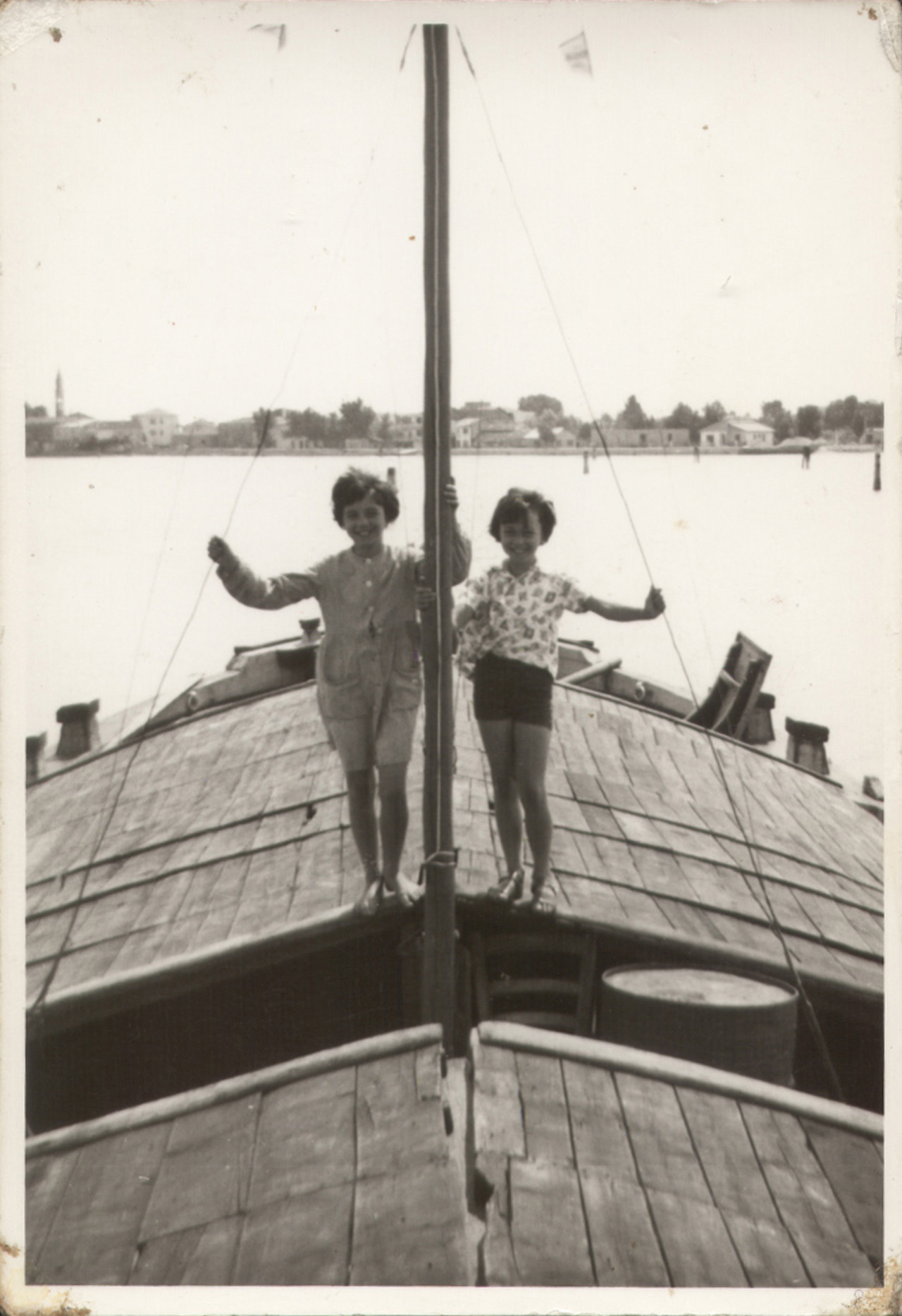 Laguna di Venezia: foto ricordo della fine degli anni Cinquanta del 1900 delle figlie del barcaro Silvestro Fusaro in posa sui boccaporti del burcio Sergio in navigazione.