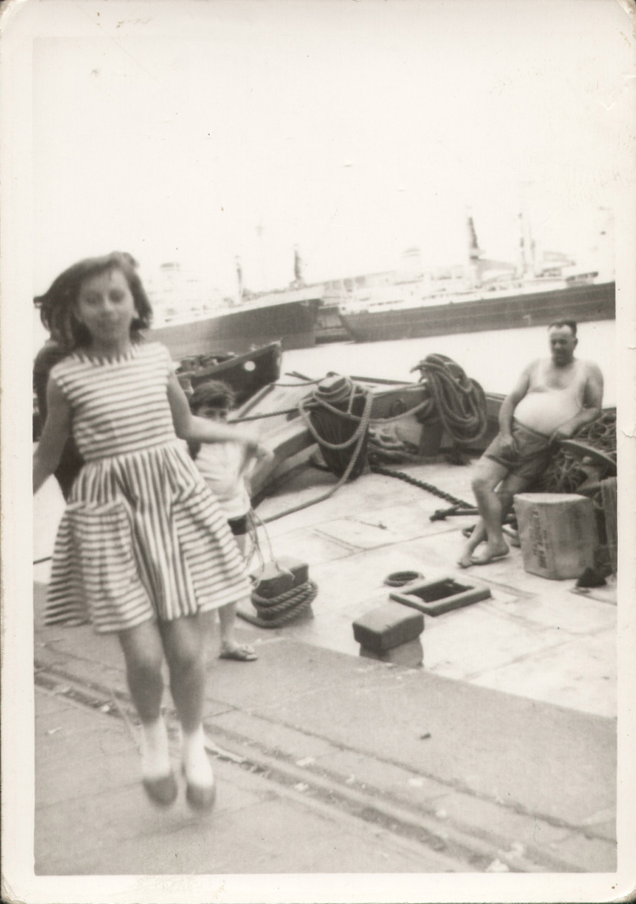 Venezia: foto ricordo scatta nel maggio 1964 di Luisella Fusaro, figlia del barcaro Silvestro Fusaro che si vede sulla destra a bordo della sua imbarcazione (il burcio Sergio) ormeggiata alla stazione marittima.