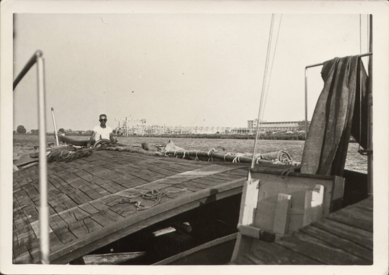 Fiume Po: si osserva un'immagine del 1956 di un'imbarcazione (il burcio Marco Polo di proprietà del barcaro Adriano Cappellozza ritratto nella foto al timone) in navigazione verso Battaglia Terme dopo aver scaricato la trachite dei Colli Euganei; sullo sfondo lo zuccherificio in località Ca' Tiepolo.