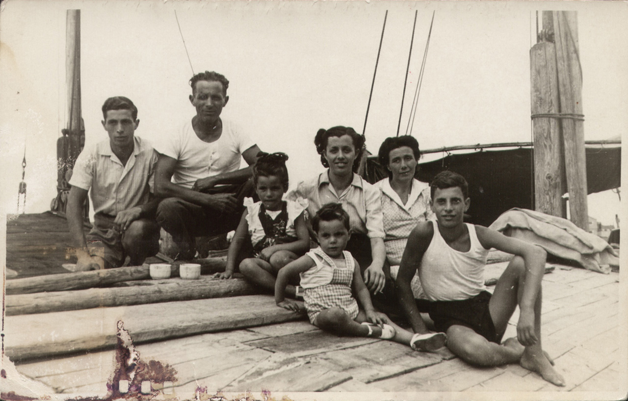 Venezia: foto ricordo scattata il 15 agosto 1949 della famiglia Cappellozza sulla sua imbarcazione (il burcio Marco Polo) in sosta in Rio Stuchy in attesa di scaricare la merce.