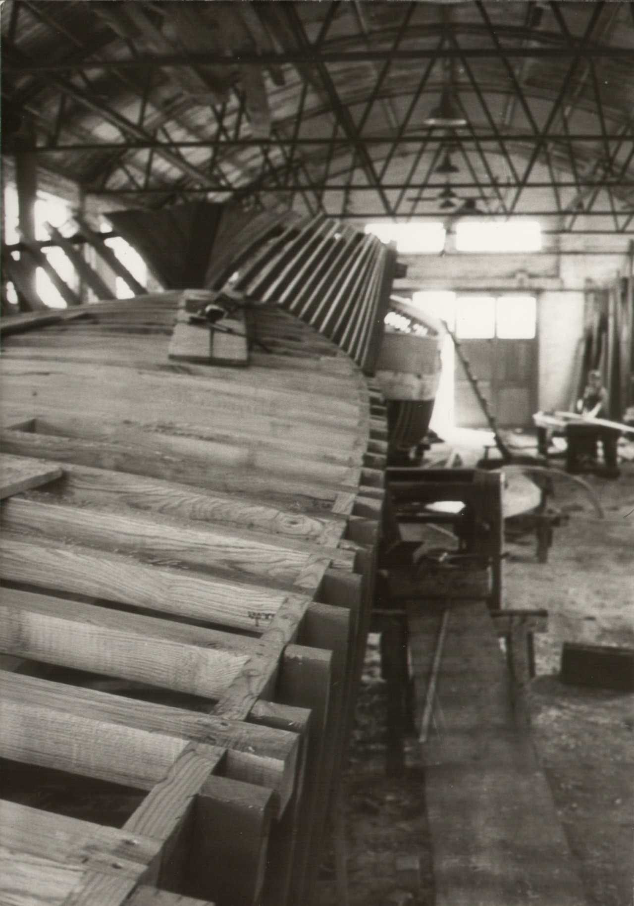 Loreo: si osserva l'interno del cantiere (squero) dei F.lli Doni; in primo piano si vede un particolare della base di costruzione di un peschereccio, mentre un altro si intravede sullo sfondo.