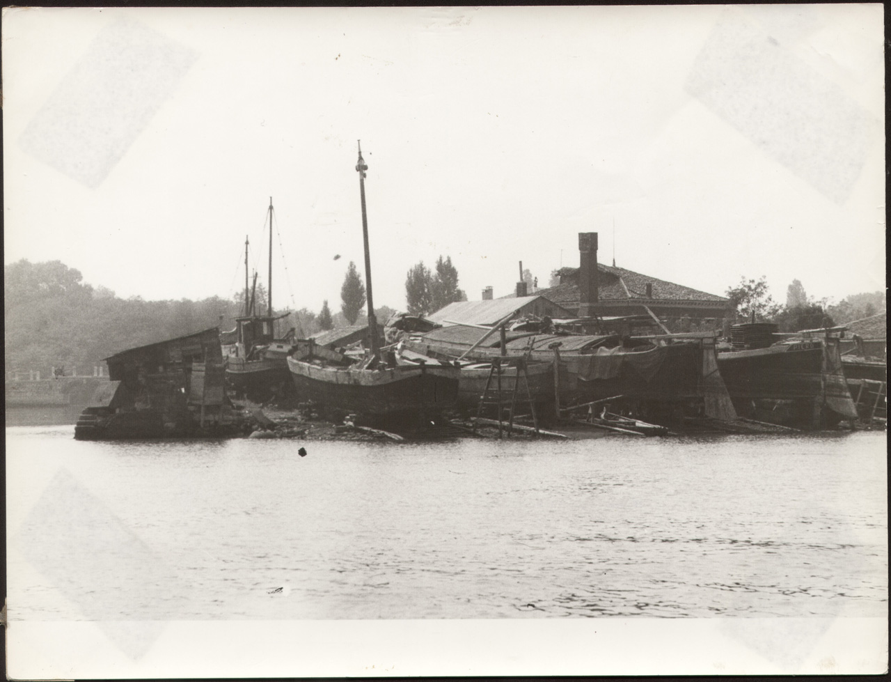 Venezia: si osserva un'immagine dell'inizio degli anni Sessanta del 1900 di alcune imbarcazioni presso il cantiere Scarpa degli Alberoni in attesa di essere riparate; la prima barca a sinistra è un topo veneziano, la terza è un bragozzo chioggiotto e la quarta è il burcio Piero di proprietà di Dino Renosto di Venezia.