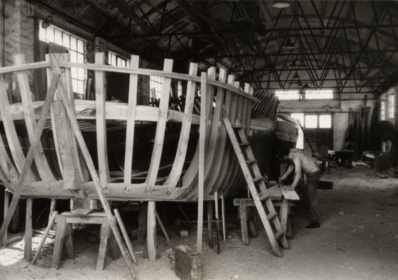 Loreo: si osserva l'interno del cantiere (squero) dei F.lli Doni. In primo piano un peschereccio in fase di costruzione con a destra un carpentiere al lavoro.