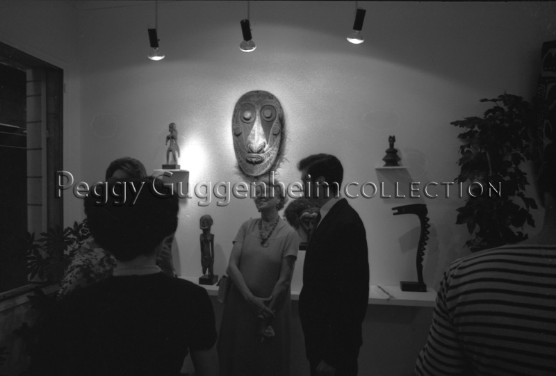 Peggy Guggenheim sorridente in compagnia dello scrittore Paolo Barozzi all'inaugurazione della mostra "Arte primitiva nera" organizzata dallo stesso nel giugno-luglio del 1960 presso l'ufficio del padre in Frezzeria a Venezia, dove furono esposte opere dei popoli Dogon, Baulè, Bambara e maschere dalla Melanesia. Lungo le pareti della stanza si possono vedere alcune delle opere esposte, tra cui una grande maschera tibale.