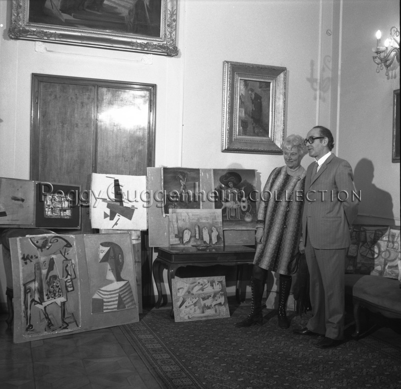 Peggy Guggenheim in questura a Venezia in compagnia del capo della Squadra Mobile della polizia Salvatore Barba, dopo il ritrovamento dei quadri che le erano stati rubati. Si vedono le seguenti opere: in alto da sinistra: William Baziotes "Senza titolo" (1943, Peggy Guggenheim Collection, PG157), Kazimir Malevich "Senza titolo" (1916, Peggy Guggenheim Collection, PG42), Leonor Fini "La pastorella delle sfingi" (1941, Peggy Guggenheim Collection), Victor Brauner "Il surrealista" (1947, Peggy Guggenheim Collection),; in basso da sinistra: Jackson Pollock "Untitle - Don Quixote" (1944, Peggy Guggenheim Collection), Pablo Picasso "Busto di un uomo con maglia a righe" (1939, Peggy Guggenheim Collection), Henry Moore "Senza titolo" (1937, Peggy Guggenheim Collection, PG189) e "Idee per sculture" (1937, Peggy Guggenheim Collection). Dietro a Salvatore Barba si intravede "La stanza" di William Baziotes (1945, Peggy Guggenheim Collection)