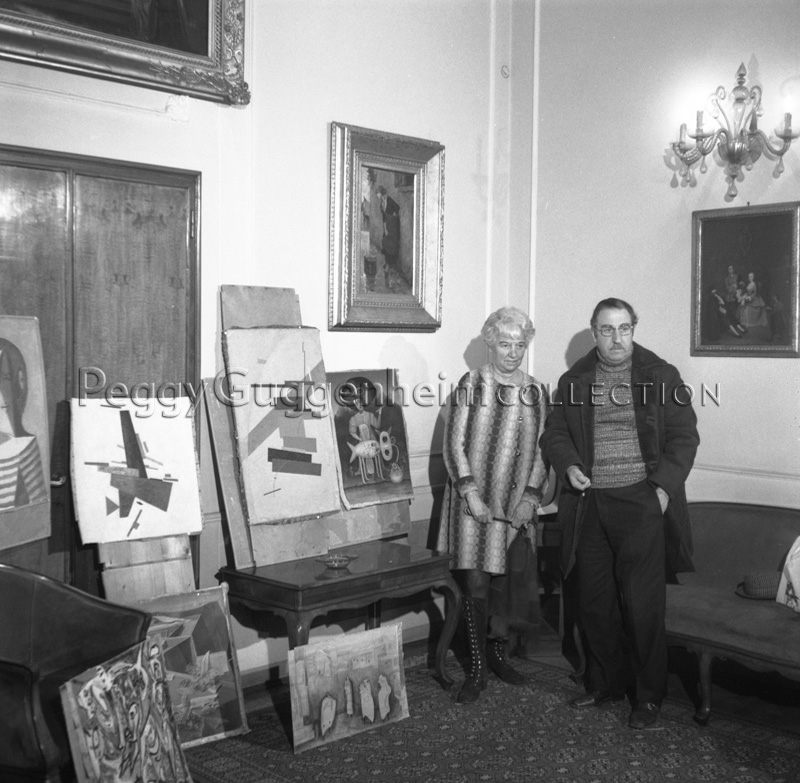 Peggy Guggenheim con l'artista Giuseppe Santomaso alla Questura di Venezia mentre esaminano i quadri rinvenuti dopo il furto subito dalla collezionista americana nel 1972. Si vedono in ordine da sinistra in basso le seguenti opere: "Sforzo d'uccello" di Jackson Pollock (1946, Peggy Guggenheim Collection), "Giardino acchiappa-aeroplani" di Max Ernst (1936-37, Peggy Guggenheim Collection), "Senza titolo" di Henry Moore (1937, Peggy Guggenheim Collection), "Senza titolo" di Kazimir Malevich (1916, Peggy Guggenheim Collection), "Senza titolo" di El Lissitzky (1919-20, Peggy Guggenheim Colletion) e "Il surrealista" di Victor Brauner (gennaio 1947, Peggy Guggenheim Collection). Alle pareti della stanza è appesa una tela che, ad una prima indagine, sembra essere di stampo veneto del settecento
