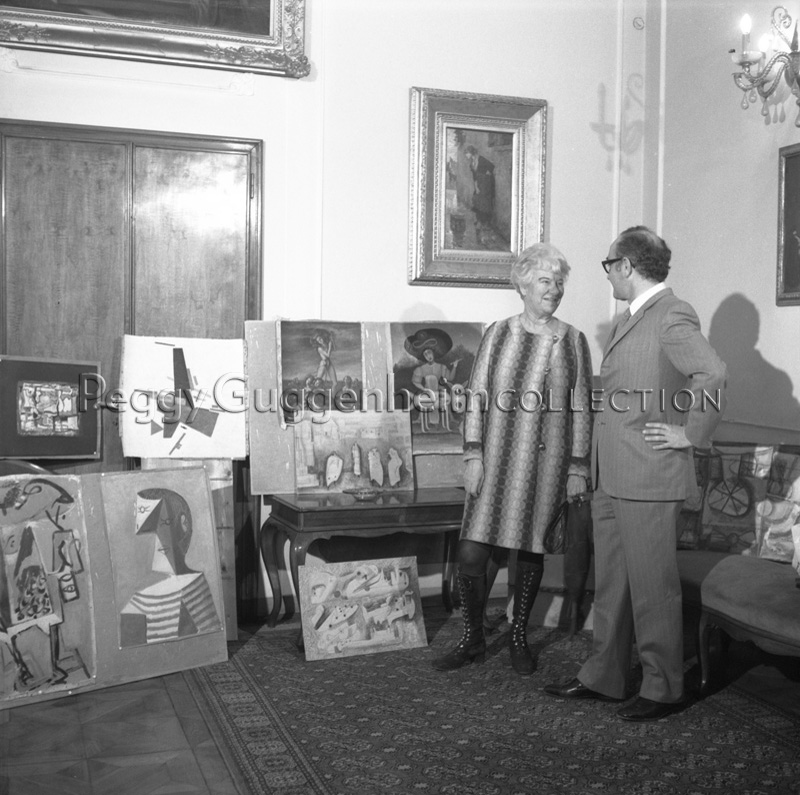 Peggy Guggenheim in questura a Venezia in compagnia del capo della Squadra Mobile della polizia Salvatore Barba, dopo il ritrovamento dei quadri che le erano stati rubati. Si vedono le seguenti opere: in alto da sinistra: William Baziotes "Senza titolo" (1943, Peggy Guggenheim Collection, PG157), Kazimir Malevich "Senza titolo" (1916, Peggy Guggenheim Collection, PG42), Leonor Fini "La pastorella delle sfingi" (1941, Peggy Guggenheim Collection), Victor Brauner "Il surrealista" (1947, Peggy Guggenheim Collection),; in basso da sinistra: Jackson Pollock "Untitle - Don Quixote" (1944, Peggy Guggenheim Collection), Pablo Picasso "Busto di un uomo con maglia a righe" (1939, Peggy Guggenheim Collection), Henry Moore "Senza titolo" (1937, Peggy Guggenheim Collection, PG189) e "Idee per sculture" (1937, Peggy Guggenheim Collection). Dietro a Salvatore Barba si intravede "La stanza" di William Baziotes (1945, Peggy Guggenheim Collection).
