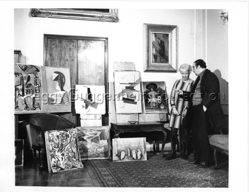 Peggy Guggenheim con l'artista Giuseppe Santomaso alla Questura di Venezia mentre esaminano i quadri rinvenuti dopo il furto subito dalla collezionista americana nel 1972. Si vedono in ordine da sinistra in basso le seguenti opere: "Sforzo d'uccello" di Jackson Pollock (1946, Peggy Guggenheim Collection), "Giardino acchiappa-aeroplani" di Max Ernst (1936-37, Peggy Guggenheim Collection), "Senza titolo" di Henry Moore (1937, Peggy Guggenheim Collection), Jackson Pollock "Senza titolo - Don Quixote" (1944, Peggy Guggenheim Collection), Pablo Picasso "Busto di un uomo in maglia a righe" (1939, Peggy Guggenheim Collection), "Senza titolo" di Kazimir Malevich (1916, Peggy Guggenheim Collection), "Senza titolo" di El Lissitzky (1919-20, Peggy Guggenheim Colletion) e "Il surrealista" di Victor Brauner (gennaio 1947, Peggy Guggenheim Collection). Alle pareti della stanza è appesa una tela che, ad una prima indagine, sembra essere di stampo veneto del settecento.