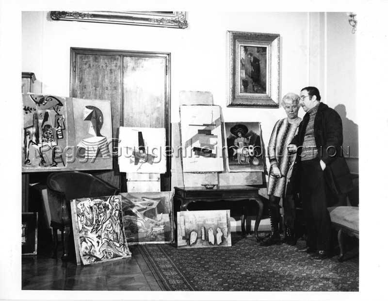 Peggy Guggenheim con l'artista Giuseppe Santomaso alla Questura di Venezia mentre esaminano i quadri rinvenuti dopo il furto subito dalla collezionista americana nel 1972. Si vedono in ordine da sinistra in basso le seguenti opere: "Sforzo d'uccello" di Jackson Pollock (1946, Peggy Guggenheim Collection), "Giardino acchiappa-aeroplani" di Max Ernst (1936-37, Peggy Guggenheim Collection), "Senza titolo" di Henry Moore (1937, Peggy Guggenheim Collection), Jackson Pollock "Senza titolo - Don Quixote" (1944, Peggy Guggenheim Collection), Pablo Picasso "Busto di un uomo in maglia a righe" (1939, Peggy Guggenheim Collection), "Senza titolo" di Kazimir Malevich (1916, Peggy Guggenheim Collection), "Senza titolo" di El Lissitzky (1919-20, Peggy Guggenheim Colletion) e "Il surrealista" di Victor Brauner (gennaio 1947, Peggy Guggenheim Collection). Alle pareti della stanza è appesa una tela che, ad una prima indagine, sembra essere di stampo veneto del settecento.