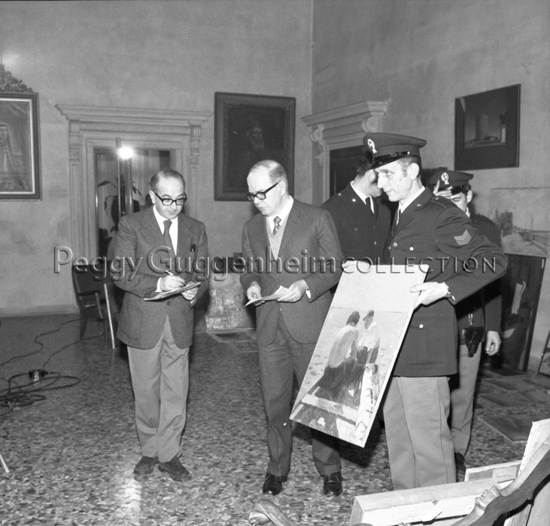 Questura di Venezia, esame e presentazione dei dipinti rinvenuti dalla polizia dopo il furto subito da Peggy Guggenheim nel 1972. A sinistra il Capo della squadra mobile della Polizia di Venezia, Salvatore Barba, assiste alle operazioni di esame della refurtiva. A destra un poliziotto regge uno dei quadri recuperati.