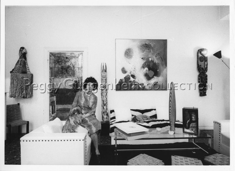 Peggy Guggenheim seduta su uno dei divani del suo salotto con accanto uno dei suoi amati cani di razza Lhasa Apsos Terriers. Emerge sulla parete di fondo della stanza l'opera di Edmondo Bacci "Avvenimento #247" (1956, Peggy Guggenheim Collection), alla destra della quale vediamo "Intaglio funerario", una delle opere della collezione di sculture dall'Oceania. A questa raccolta appartiene anche "Figura", la scultura appesa al muro all'estrema destra dell'immagine. Dal lato opposto invece è collocata "Maschera da corteccia" del gruppo Sculture dalle Americhe. Sul tavolino della sala infine è collocata l'opera di Joseph Cornell "Pappagallo che predige il futuro" (1937-38, Peggy Guggenheim Collection).