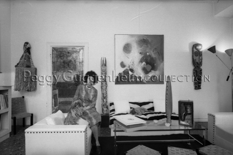 Peggy Guggenheim seduta su uno dei divani del suo salotto con accanto uno dei suoi amati cani di razza Lhasa Apsos Terriers. Emerge sulla parete di fondo della stanza l'opera di Edmondo Bacci "Avvenimento #247" (1956, Peggy Guggenheim Collection), alla destra della quale vediamo "Intaglio funerario", una delle opere della collezione di sculture dall'Oceania. A questa raccolta appartiene anche "Figura", la scultura appesa al muro all'estrema destra dell'immagine. Dal lato opposto invece è collocata "Maschera da corteccia" del gruppo Sculture dalle Americhe. Sul tavolino della sala infine è collocata l'opera di Joseph Cornell "Pappagallo che predice il futuro" (1937-38, Peggy Guggenheim Collection).