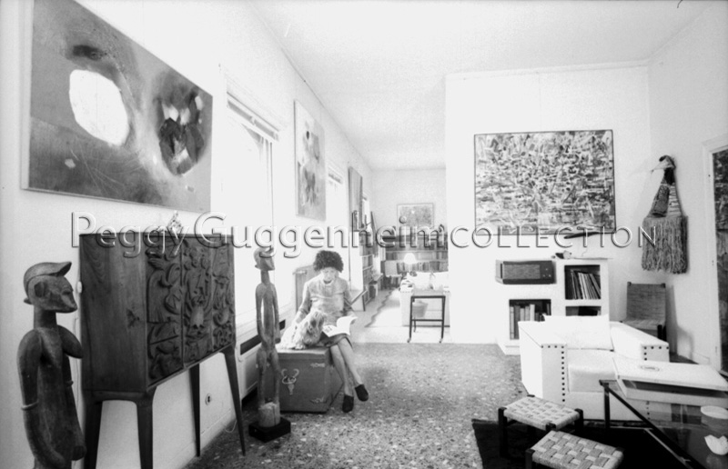 Peggy Guggenheim a palazzo Venier dei Leoni seduta su una panca con uno dei suoi cani di razza Lhasa Apsos Terriers a fianco. Lungo la parete a sinistra della foto si può vedere un'opera di Edmondo Bacci, "Coppia di figure maschili e femminili" delle Sculture dall'Africa e Henry Moore "Figura sdraiata" (1938, Peggy Guggenheim Collection). A destra dell'immagine invece Tancredi con "Composizione" (1957, Peggy Guggenheim Collection) e "Maschera da corteccia" delle Sculture dall'America. Tra le due finestre della sala si vede sommariamente un'altra opera di Bacci, "Avvenimento #247" (1956, Peggy Guggenheim Collection).
