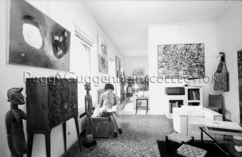 Peggy Guggenheim a palazzo Venier dei Leoni seduta su una panca con uno dei suoi cani di razza Lhasa Apsos Terriers a fianco. Lungo la parete a sinistra della foto si può vedere un'opera di Edmondo Bacci, "Coppia di figure maschili e femminili" delle Sculture dall'Africa e Henry Moore "Figura sdraiata" (1938, Peggy Guggenheim Collection). A destra dell'immagine invece Tancredi con "Composizione" (1957, Peggy Guggenheim Collection) e "Maschera da corteccia" delle Sculture dall'America. Tra le due finestre della sala si vede sommariamente un'altra opera di Bacci, "Avvenimento #247" (1956, Peggy Guggenheim Collection).