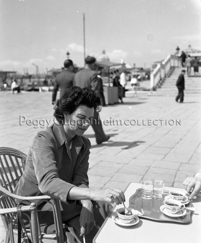 Peggy Guggenheim al tavolino di un bar in Riva degli Schiavoni, in prossimità del Ponte della Pietà, a Venezia. Era a pranzo con la principessa Aspasia di Grecia, in occasione della Biennale del 1949.