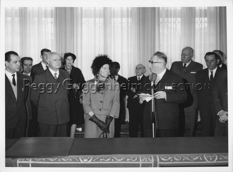 Peggy Guggenheim ascolta il discorso pronunciato dal sindaco di Venezia Giovanni Favaretto Fisca il giorno in cui le fu conferita la cittadinanza onoraria, il 5 febbraio 1962 al Municipio di Venezia.