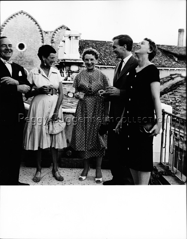 Peggy Guggenheim con un'amica più anziana e una giovane coppia, fanno conversazione su un terrazzo, bevendo un drink. Probabilmente in occasione di un'esposizione. Anni '50.
