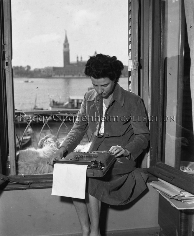Peggy Guggenheim alla finestra di una delle stanze dell'Hotel "Savoia e Jolanda", sulla Riva degli Schiavoni, a Venezia, mentre lavora alla macchina da scrivere. Accanto a lei uno dei suoi cani di razza Lhasa Apsos Terrier. Dalla finestra si vede, in lontananza, l'isola di San Giorgio.