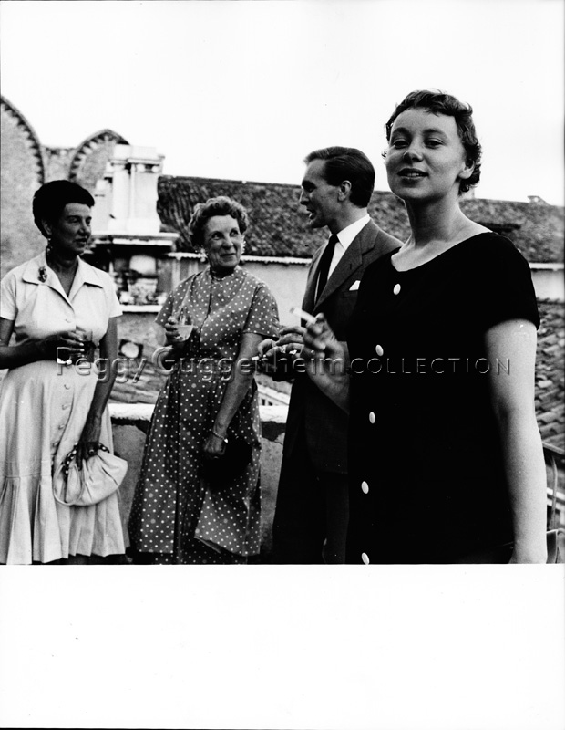 Peggy Guggenheim con un'amica più anziana e una giovane coppia, fanno conversazione su un terrazzo, bevendo un drink. Probabilmente in occasione di un'esposizione. Anni '50.